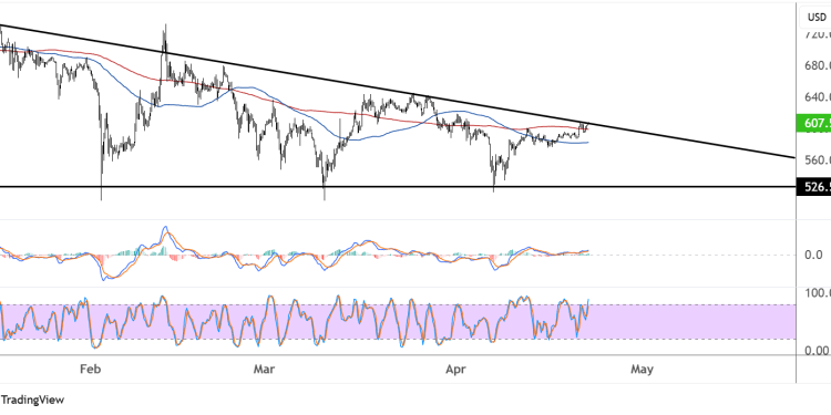 The descending triangle has established clear support and resistance boundaries that traders should monitor closely. The upper triangle resistance currently sits around $620-630, which has repeatedly capped upside attempts during April. A decisive break above this level could signal a shift in the near-term trend.