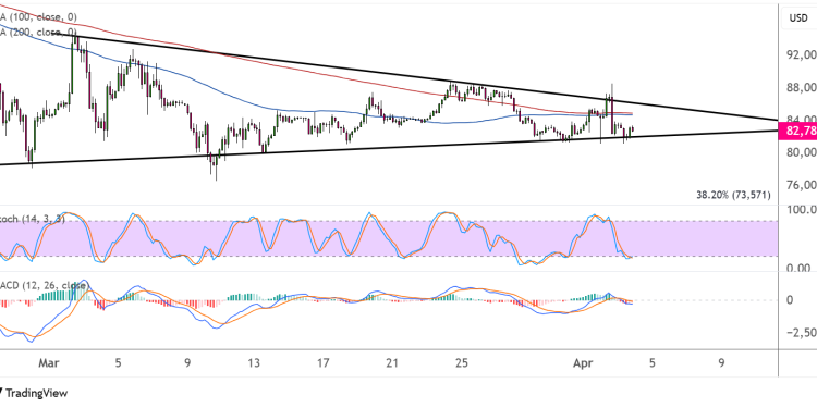 Bitcoin is currently trading at $82,781, finding itself in a precarious position within a well-defined symmetrical triangle pattern that has been forming since early March.